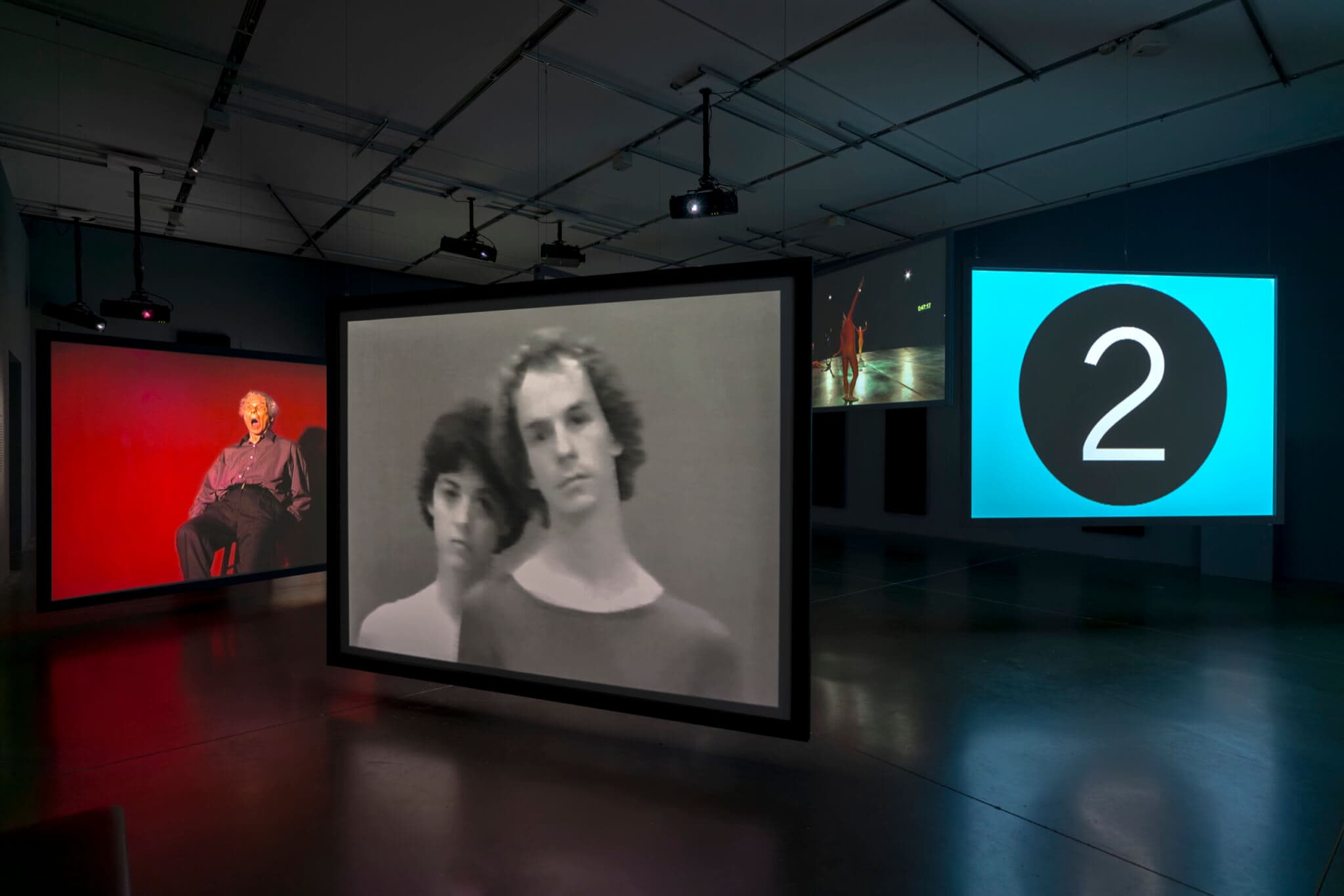 Atlas has long navigated the polarity of two intersecting but distinct worlds: modernist avant-garde dance and queer underground subcultures. If A Prune Twin represents the latter, the installation MC9 (2012) represents the former, as embodied in the figure of Merce Cunningham. It includes clips from dozens of their collaborative works, from Walkaround Time (1973) to Ocean (2010), representing a decades-long exploration of how dancers and cameras can interact. The work’s spatial presence creates its own kind of choreography—bodies rush across the room, gathering and dispersing like atmospheric patterns of pressure and vapor. The soundtrack jumps from minimal flute to electronic noise, and is sometimes overtaken by the tender sound of dancers’ feet on the floor. As with A Prune Twin, sensory overstimulation is balanced with moments of order. Individual screens periodically flash to brief sequences of a colored countdown leader, lending the work a sense of urgency and careful calibration. These flashes of color, sometimes coordinated across screens, create moments of alignment between different rhythms, like dancers converging to share a pose onstage. As fractured as it is, MC9 functions as a single machine of dance and images and time.
