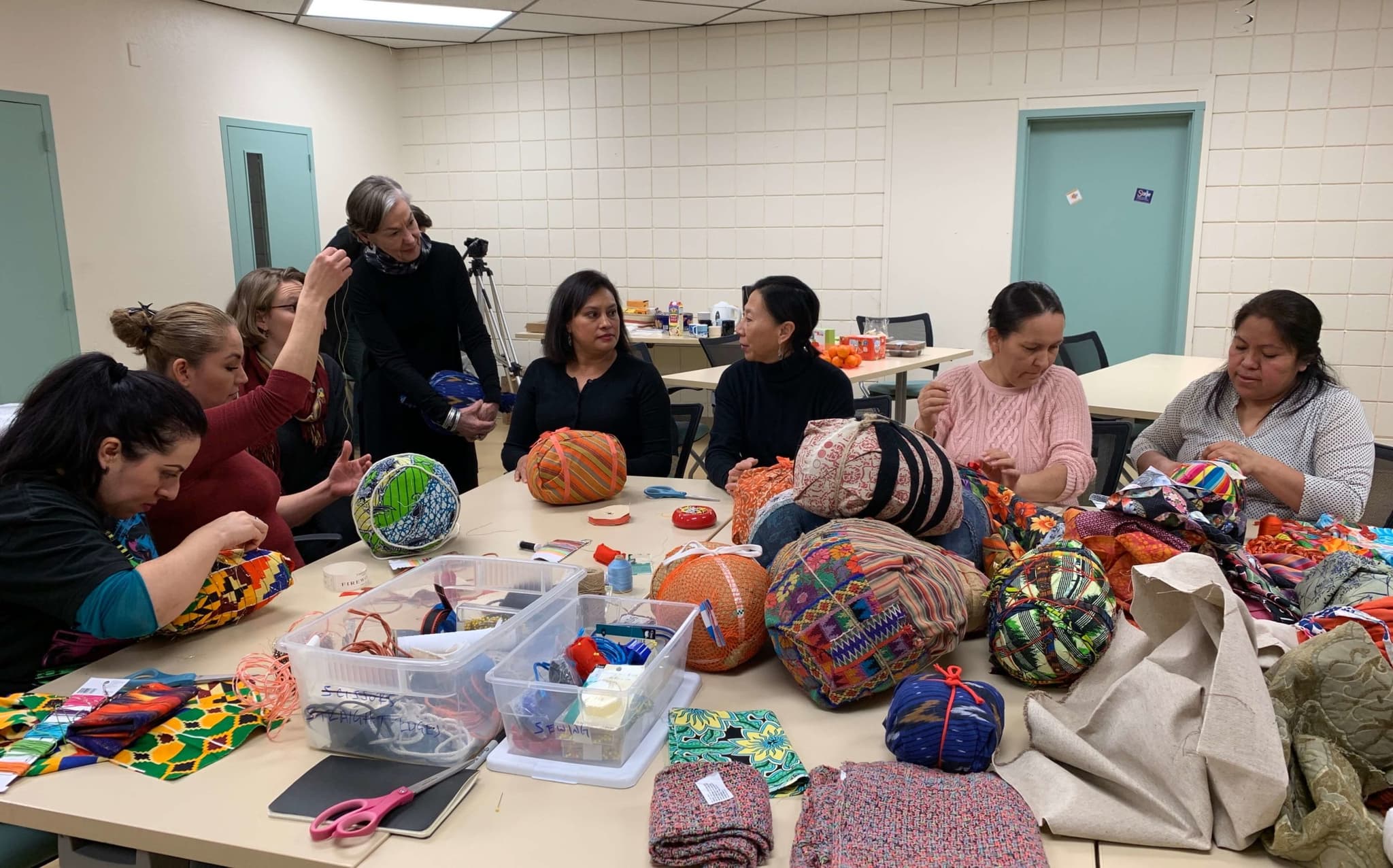 Yu-Wen Wu and Harriet Bart with members of the Adelante Women’s Collective in Santa Fe, NM, creating cloth bundles for Leavings/Belongings (2019). Image courtesy of the artist.