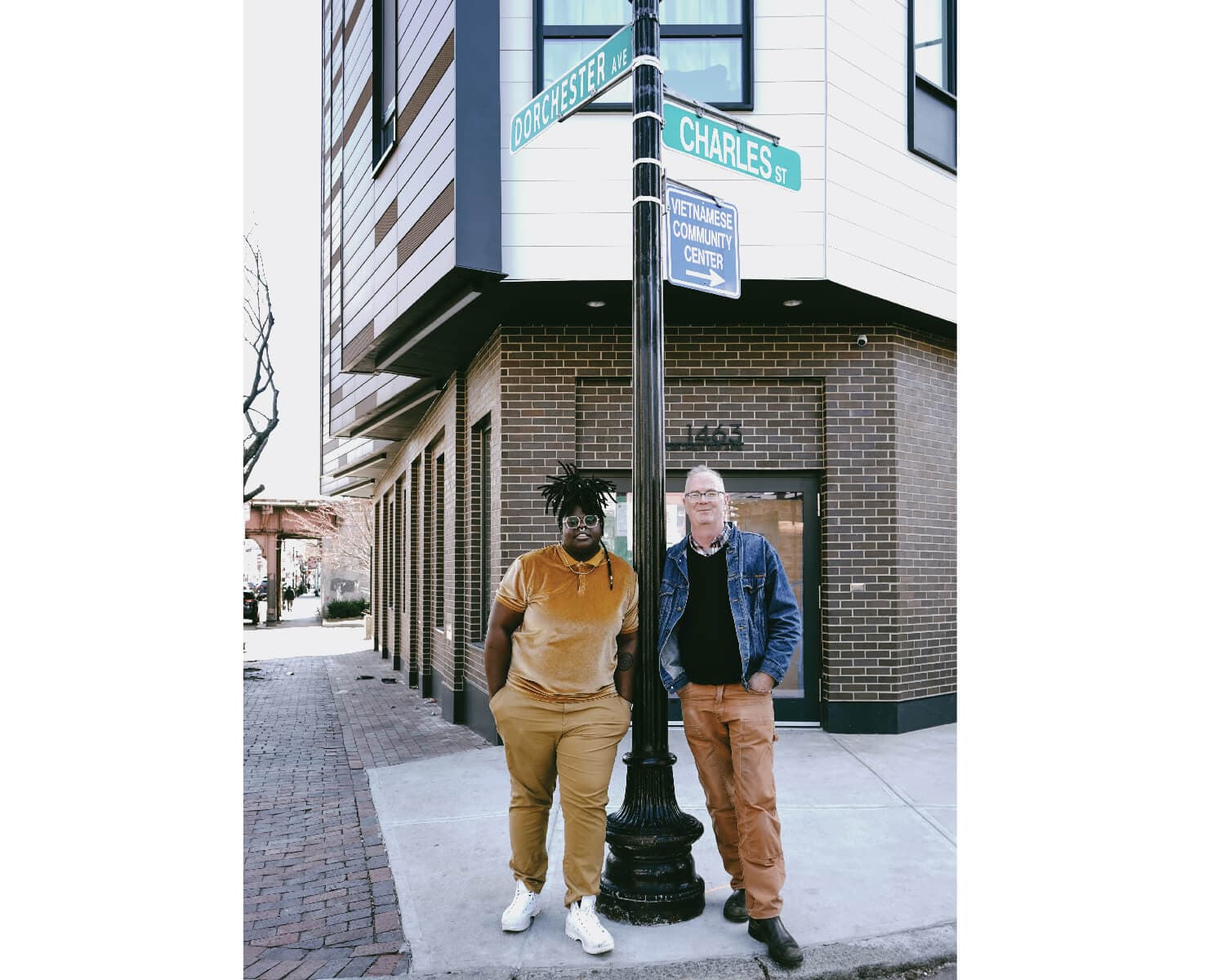 justBook-ish co-founders Porsha Olayiwola and Bing Broderick outside the site of the future bookstore at 1463 Dorchester Avenue. Photo by Stefanie Belnavis for Boston Art Review.