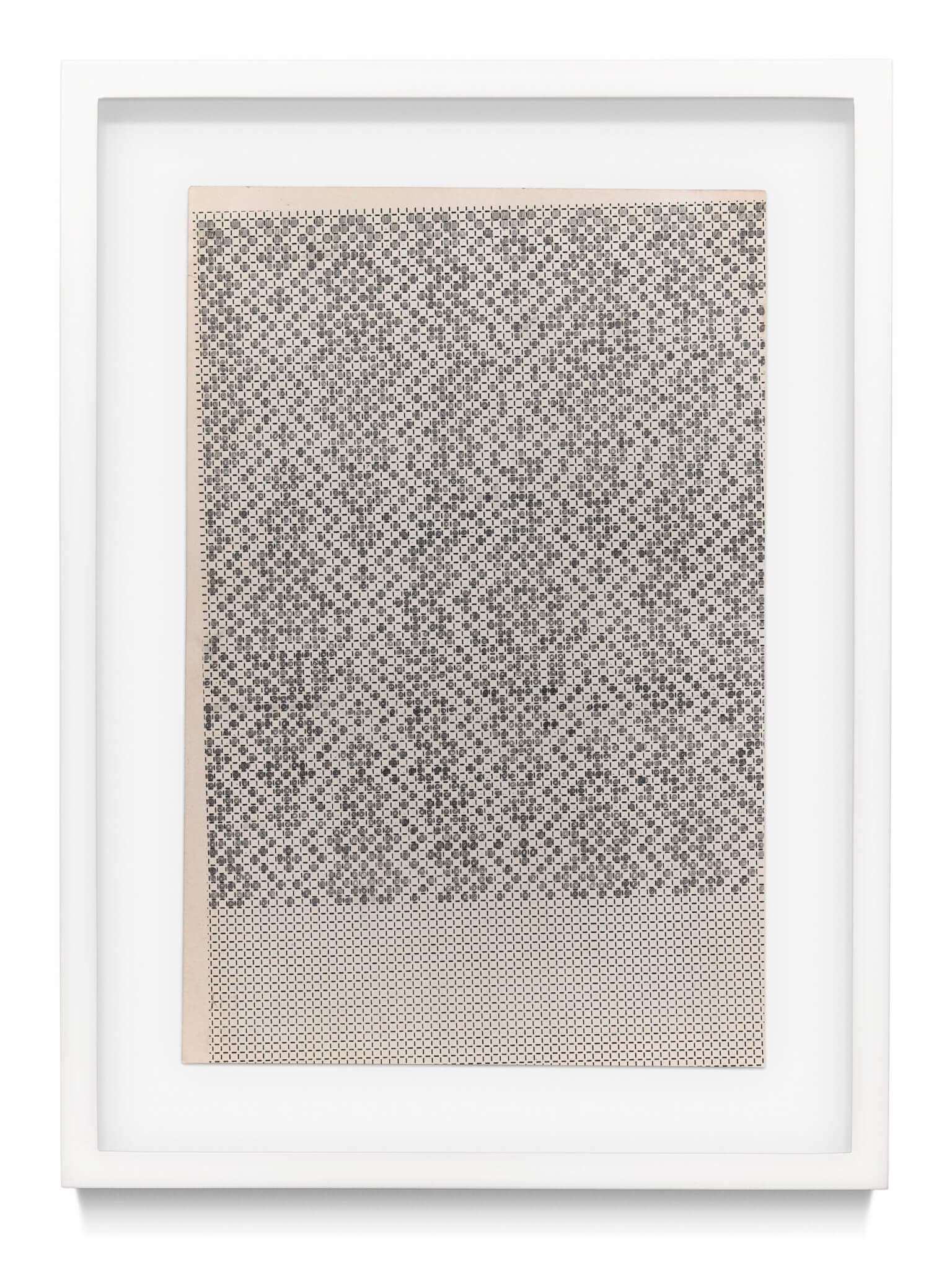 In Sterope (2024), a pattern of dashes forms a grid of squares. The margins at the top and left are uneven. Printed askew, the pattern—a device from another time, the kind of template that was well-used when more clothes were handmade—runs to the right edge and the bottom of the 8 ¾ x 5 ⅞ inch page. With a pencil, Burge filled about half of the squares with neat circles such that a loose and wavy chevron pattern emerges when viewers stand back from the work. Across the gallery and about five times larger than Sterope, Star Data II (2024) is a tight and extensive variegated gray-black network of small boxes without any evident overall pattern. It could suggest skyscrapers in a dense cityscape or an earnest researcher’s attempt to impose a grid on the night sky. As Burge noted, “Both astronomers and weavers use grids to organize their information.” And, grids are abundant in the show at Krakow Witkin. For Electra (2024), Burge cut one apart and reconfigured it out of sync, the pieces at off angles like sections adrift—parts without the benefit of gravity to keep them attached. She started Star Data after considering réseau plates at Harvard, which use grid marks that help facilitate astronomical measurements. Points of negative space in her drawing refer to stars. “The grid works here as a reliable marker of magnification, focus, distance, and orientation,” Burge told me during a later conversation on Zoom. “I think of the grid as a finding tool, a guide, an infrastructure where organization or disorganization can take shape.”